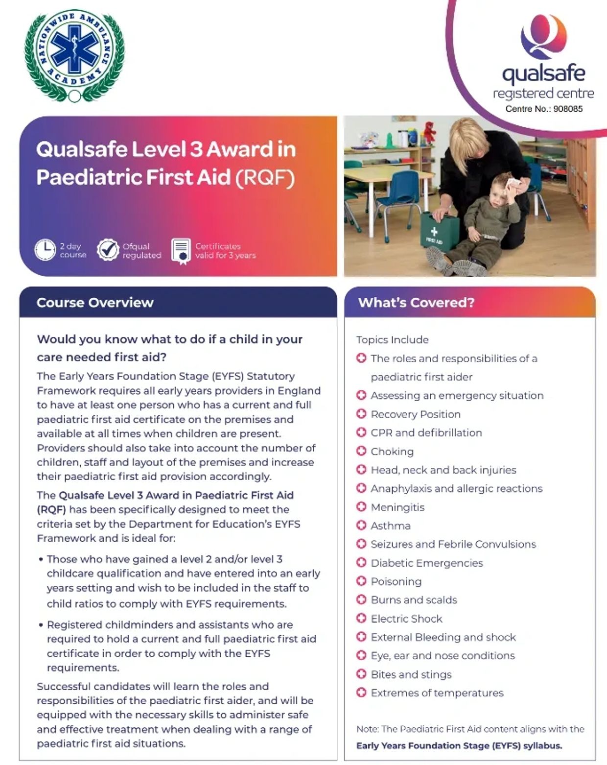 Successful learners will receive a personalised Qualsafe Level 3 Award in Paediatric First Aid (RQF) e-Certificate.